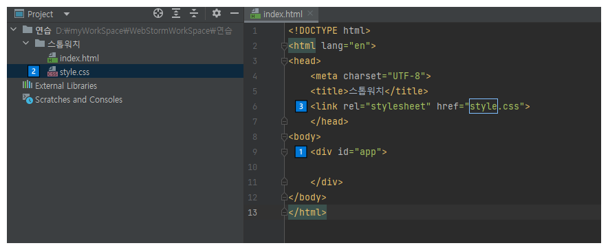 - 1️⃣div박스로 id명 app과 2️⃣style.css 파일 만들고 3️⃣<link>태그로 index.html 파일과 연결합니다