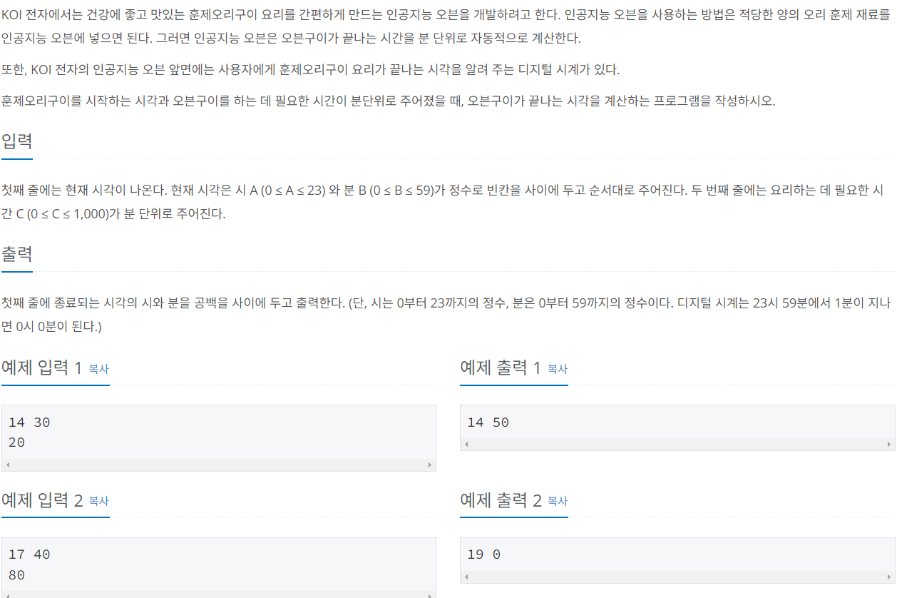 이 문제는 주어진 시간과 요리 시간을 입력해서 요리가 끝나는 시간을 계산하는 문제이며, 다음은 풀이의 핵심 단계입니다.