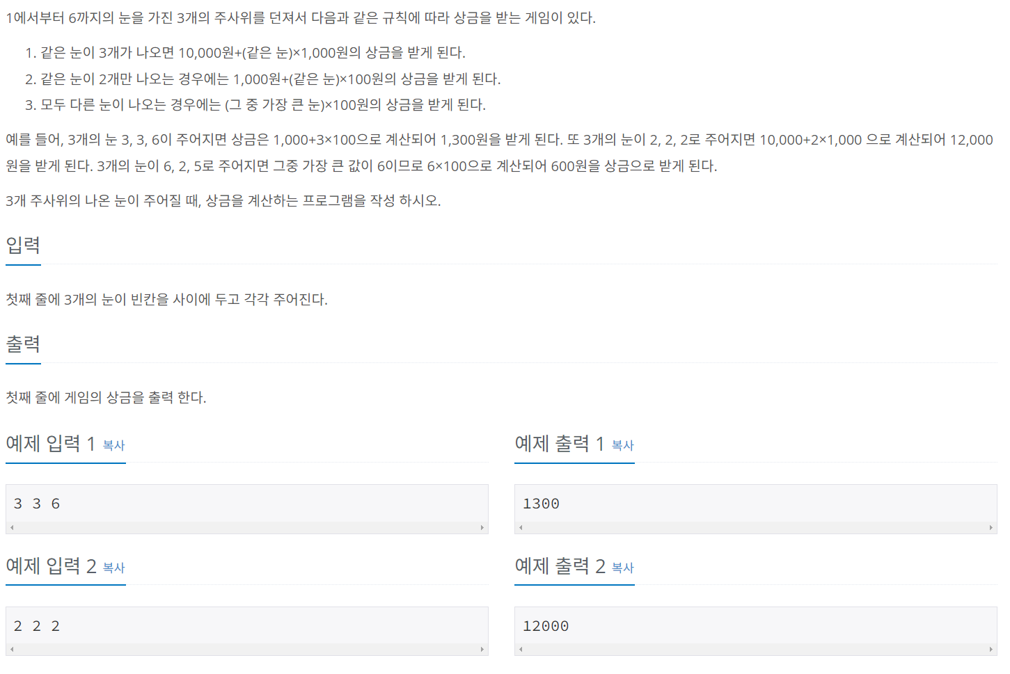 이 문제는 주사위를 던저서 나온 눈에 따라 if - else 문으로 각 해당하는 조건에 상금을 계산합니다.
