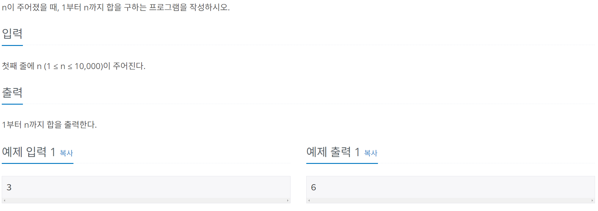 이 문제는 주어진 정수 n에 대해 1부터 n 까지의 합을 구하는 문제입니다.